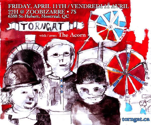 Vendredi soir, le Zoobizarre a aussi décidé de laisser tomber la fête et de recevoir l'excellente formation montréalaise Torngat. Pensez Bell Orchestre ou Pawa up first avec un peu d'assouplissant. Mais pas du Bounce, plutôt du Snuggle, avec le petit ours. Pensez à un cor français et à une douce musique atmosphérique. Ou laissez faire, allez écouter la page MySpace du groupe. On se voit vendredi.